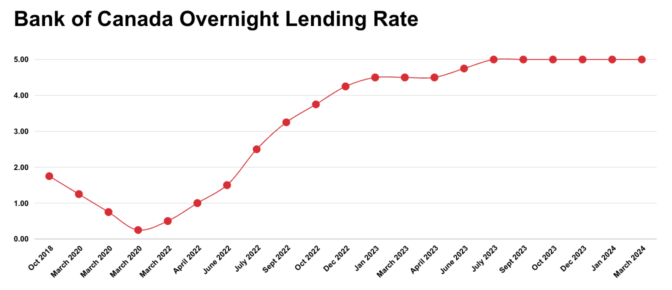 Today, the Bank maintained its target for the overnight rate at 5%, with the Bank Rate at 5¼% and the deposit rate at 5%, while also continuing its policy of quantitative tightening.