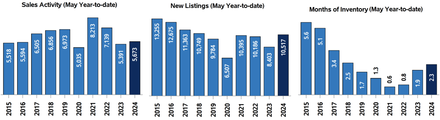 - Active residential listings numbered 3,552 units on the market at the end of May 2024, a gain of 59.4% from May 2023. Active listings were 72.2% above the five-year average and 2.9% below the 10-year average for the month of May.